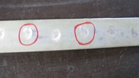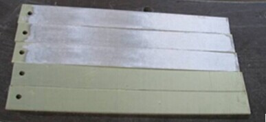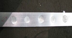 试验选用材料为3mm铝合金LD10和2mm铝合金LF6,试片尺寸为30mm *300mm(点焊材料如图1所示);其中3mm铝合金LD10表面经过阳极化处理,图中黄绿色的试片。本实验采用二组试片点焊,A组为阳极化处理的铝合金LD10和铝合金LF6点焊;B组为未阳极化处理的铝合金LD10和铝合金LF6点焊。采用合适的点焊工艺参数,焊前对表面进行酸洗[2],焊后观察焊点表面形貌,并选取焊点良好的接头做能谱分析和硬度测试,同时磨平抛光腐蚀处理后,观察焊点的显微组织。